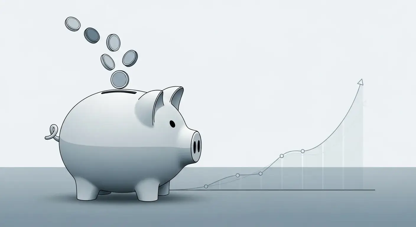 작은 돈을 꾸준히 저축하여 복리 효과로 자산이 늘어나는 과정을 보여주는 그림.